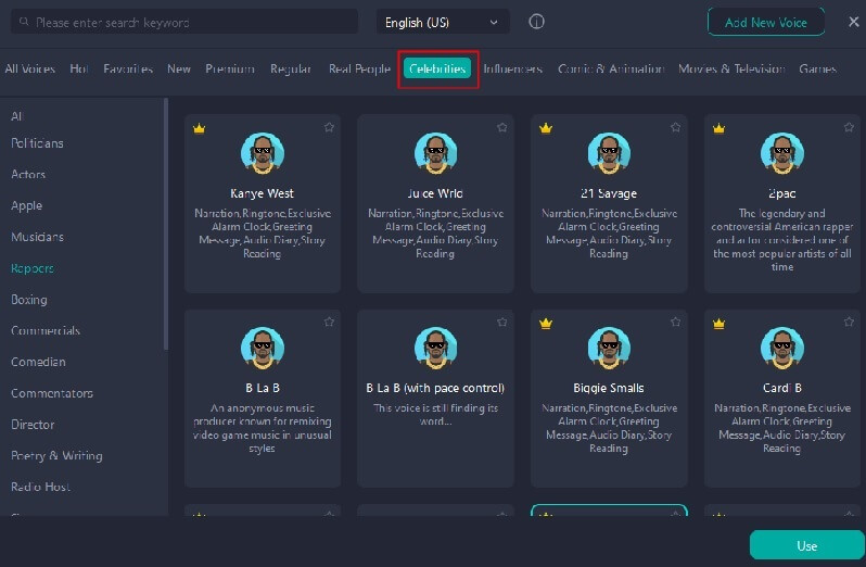 - 多样化的语音类别:探索各种声音类别,包括动漫人物、著名名人、歌手和政治人物。