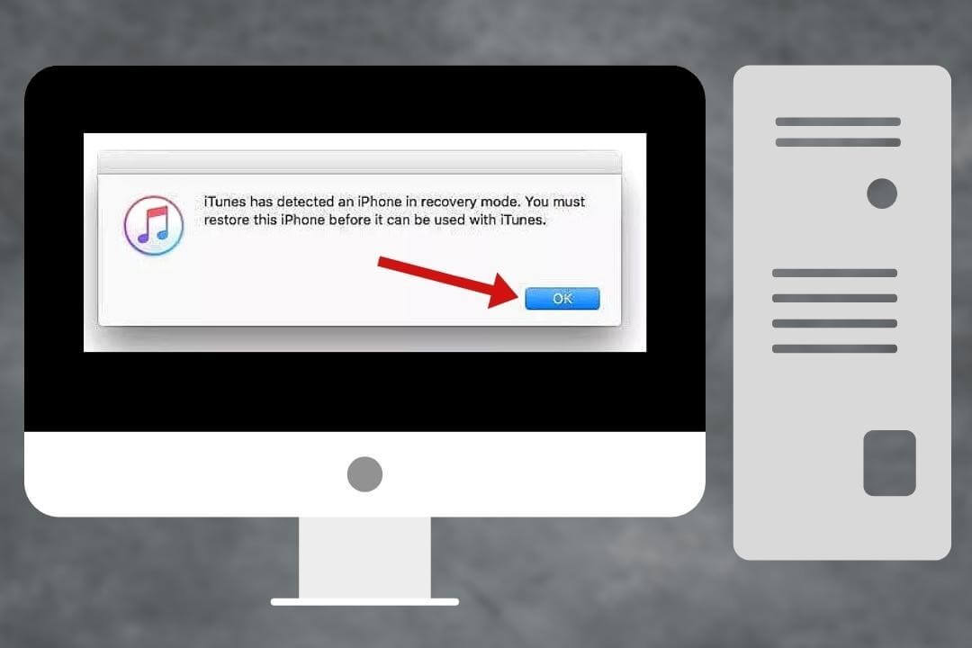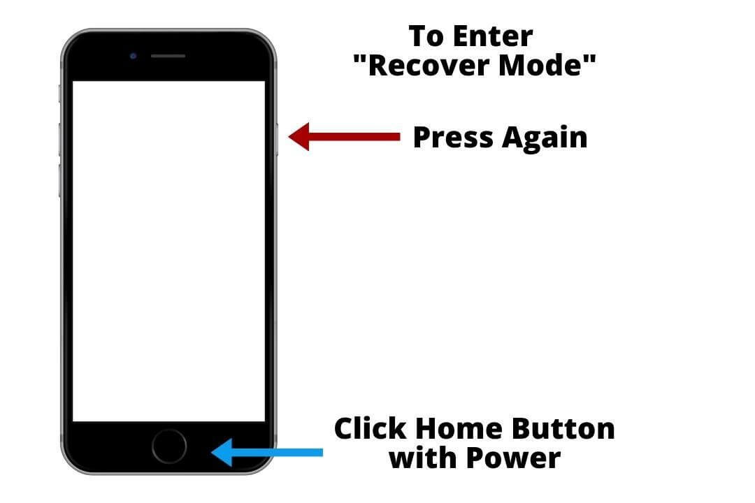 - 步骤2:现在关闭你的iPhone,然后同时按住“电源和主页按钮”来“重新启动”。直到桌面屏幕显示“在恢复模式下检测到 iPhone”时才松开。