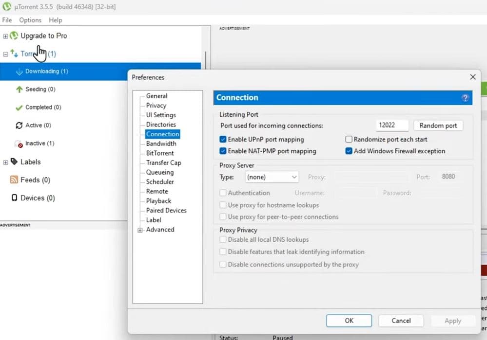 - 打开uTorrent > 选项 > 首选项 > 连接。