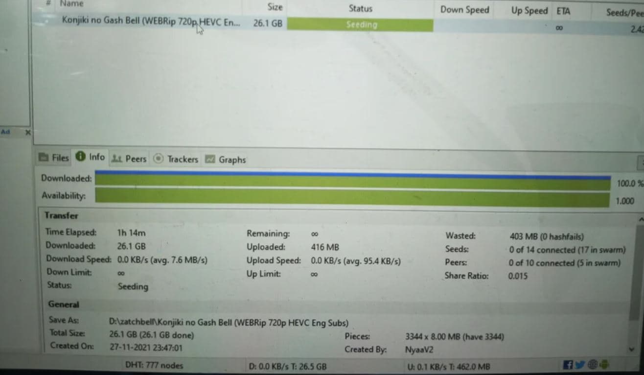 - 让 torrent 运行几个小时以连接可用的播种机。