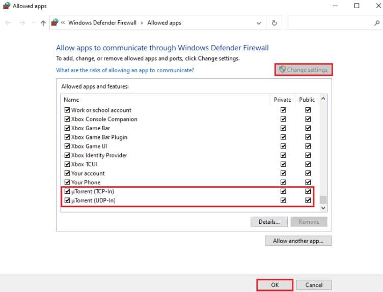 - 接下来,在允许的应用程序和功能下,单击以启用 µTorrent (TCP-In) 和 µTorrent(UDP-In) 旁边的两个复选框。