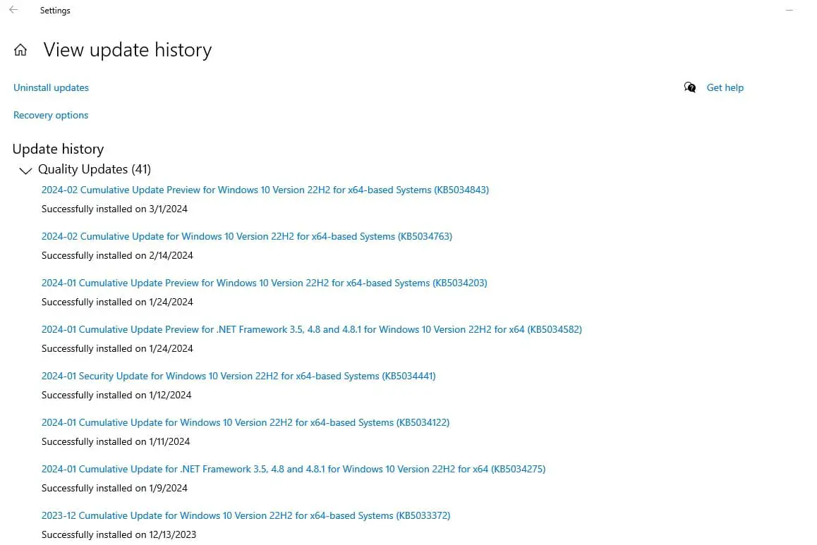 首先,打开 Windows 设置 -> 更新和安全 -> Windows 更新 -> 查看更新历史记录,并记下 Windows 在你的设备上不断提供或安装的 KB 编号。