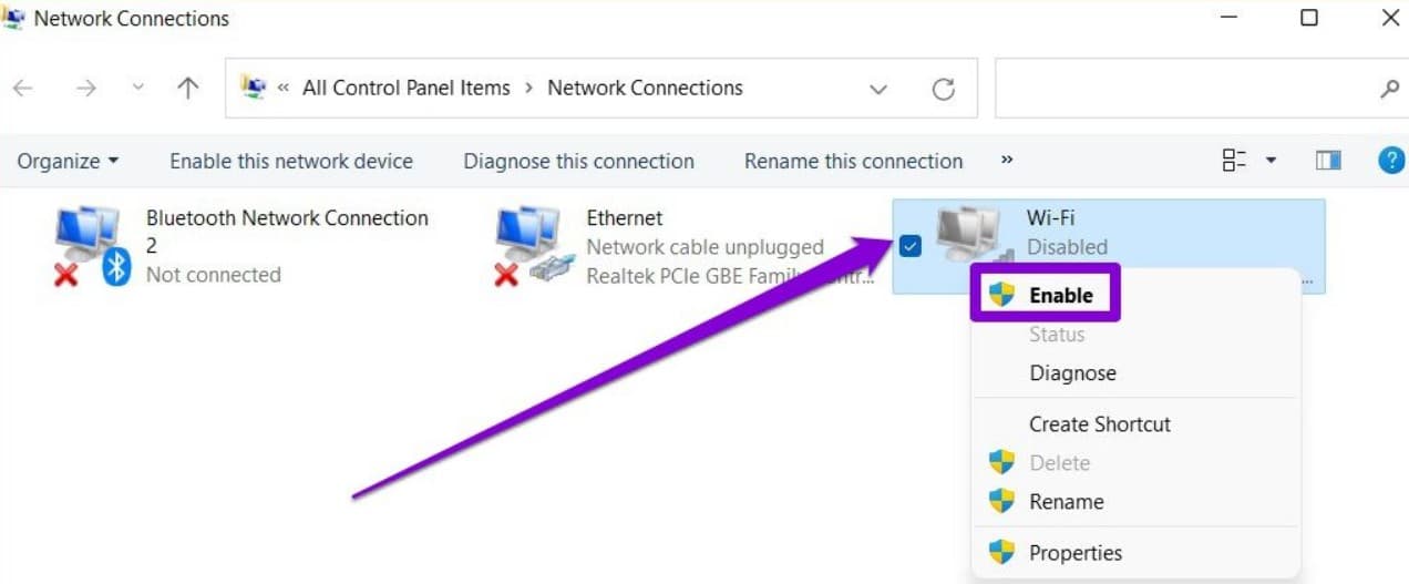 - 在那里找到您的 wifi 适配器,右键单击它,选择启用。如果它已启用,则只需禁用并重新启用它。