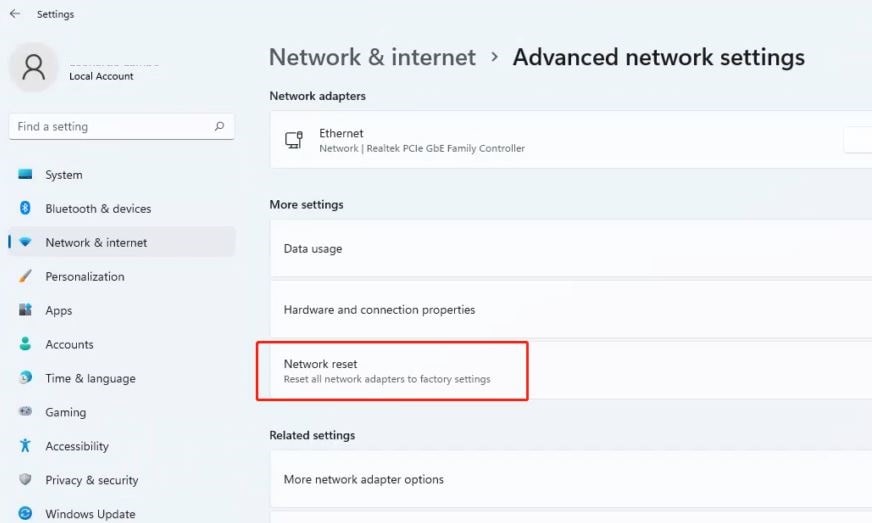 - 转到左侧窗格中的网络和互联网,然后向下滚动并单击高级网络设置,