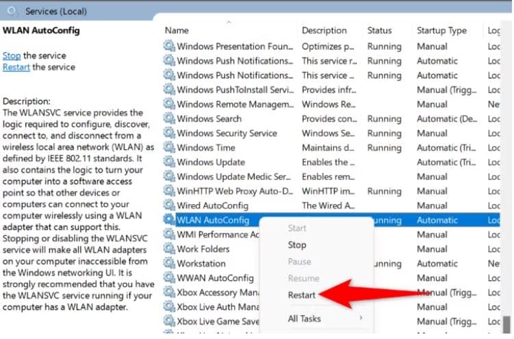 - 向下滚动服务列表,右键单击 WLAN 自动配置,然后选择重新启动。如果该选项显示为灰色,请选择“开始”。