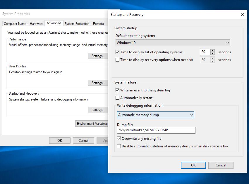 - 您现在会发现系统故障下存在自动重新启动选项。您必须取消选择该选项,并且还必须选择其旁边的“将事件写入系统日志”框,以便该功能记录计算机的问题。