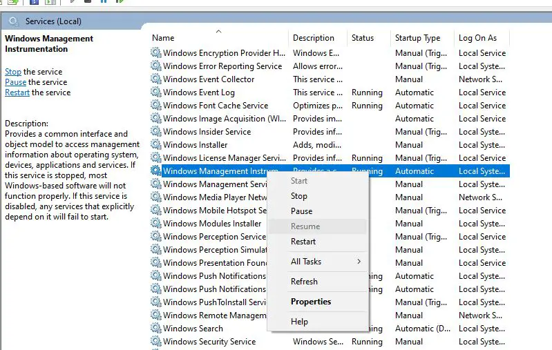 - 向下滚动并查找服务Windows 管理仪器,右键单击它,然后选择重新启动。