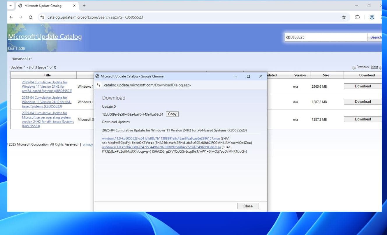- 现在使用Windows 更新目录网站搜索您记下的 KB 编号指定的更新。根据您的计算机是 32 位 = x86 还是 64 位 = x64 下载更新。
