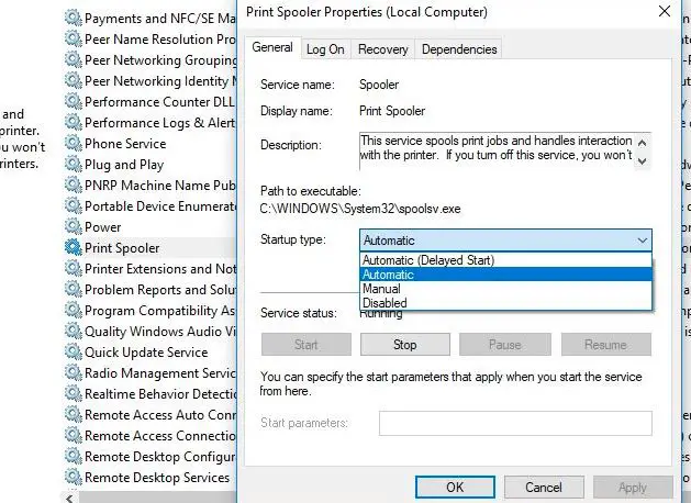 - 如果打印后台处理程序服务未启动,请右键单击并选择属性,此处将启动类型更改为自动,然后启动服务状态旁边的服务。