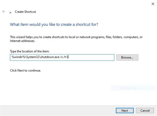 - 在位置字段中,输入%windir%System32shutdown.exe /s /t 0