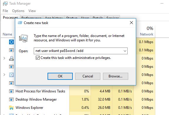 - 在任务管理器上单击文件 -> 键入 cmd 并选中使用管理权限创建此任务。