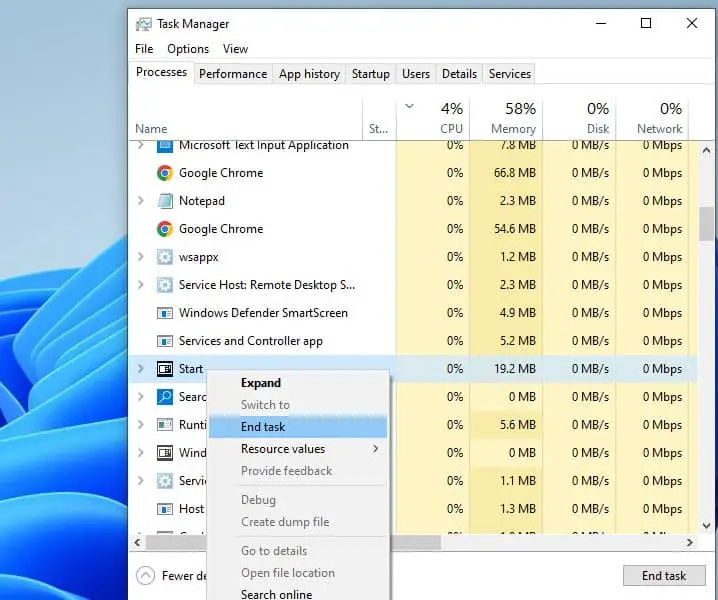 是的,如果开始菜单不起作用或无法在您的计算机上打开,这是您需要做的第一件事。只需右键单击任务栏并选择任务管理器选项即可。在进程选项卡下查找名为的进程“开始”右键单击它并选择结束任务。