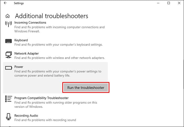 - 让故障排除程序检测并修复任何不正确的电源计划配置