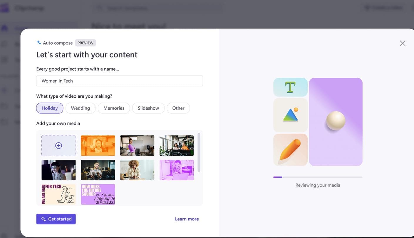 Clipchamp 现在提供自动构图功能,可根据您的图像和素材提供场景、编辑和叙述建议。这使您能够轻松地以专业的方式创建和编辑视频,非常适合与家人、朋友和社交媒体上分享。首先,只需直接从任务栏上的搜索中搜索 Clipchamp 应用程序即可。