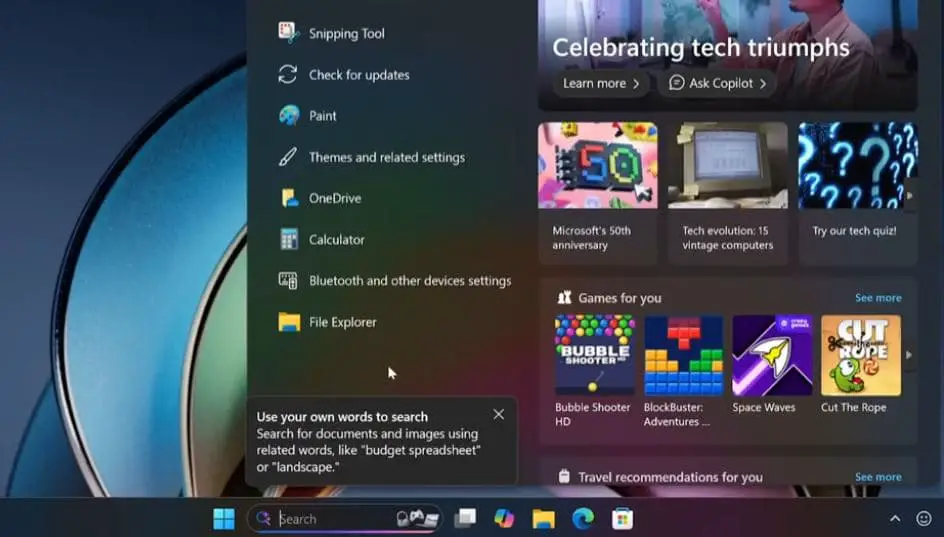 得益于语义索引模型与传统词汇索引的结合,Windows 搜索在 Copilot+ PC 上获得了重大升级。这允许自然语言搜索,从而更轻松地查找文件、照片和设置。
