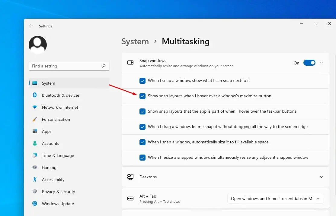 - 现在,在右侧选中或取消选中“当我将鼠标悬停在窗口的最大化按钮上时显示快照布局”框,以在 Windows 11 上禁用或启用快照布局。