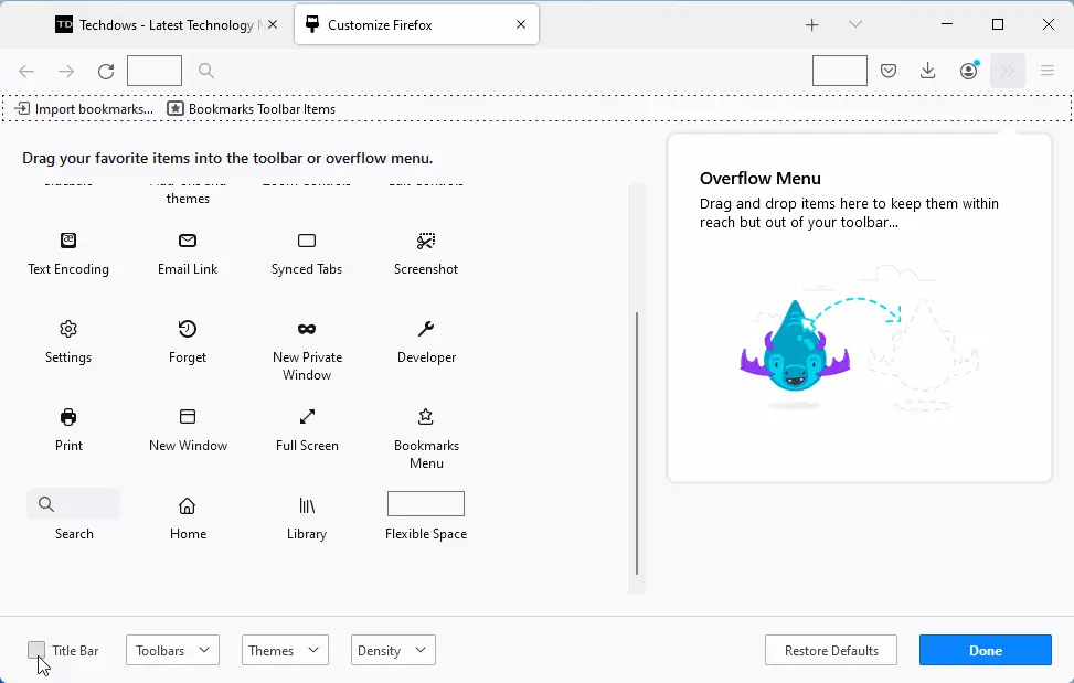 一些用户提到 Firefox 中缺少捕捉布局,将鼠标光标悬停在最大化按钮上没有任何显示。这是因为 Firefox 用户需要禁用 Firefox 当前使用的标题栏,以使其与 Snap Layouts 兼容。