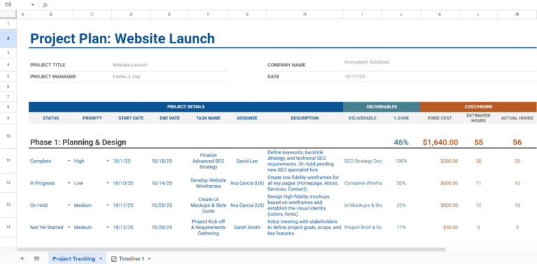 对于更丰富的时间表,我强烈建议您包含其他详细信息,例如每个任务的“受让人”列(指定负责人)和“描述”列。
