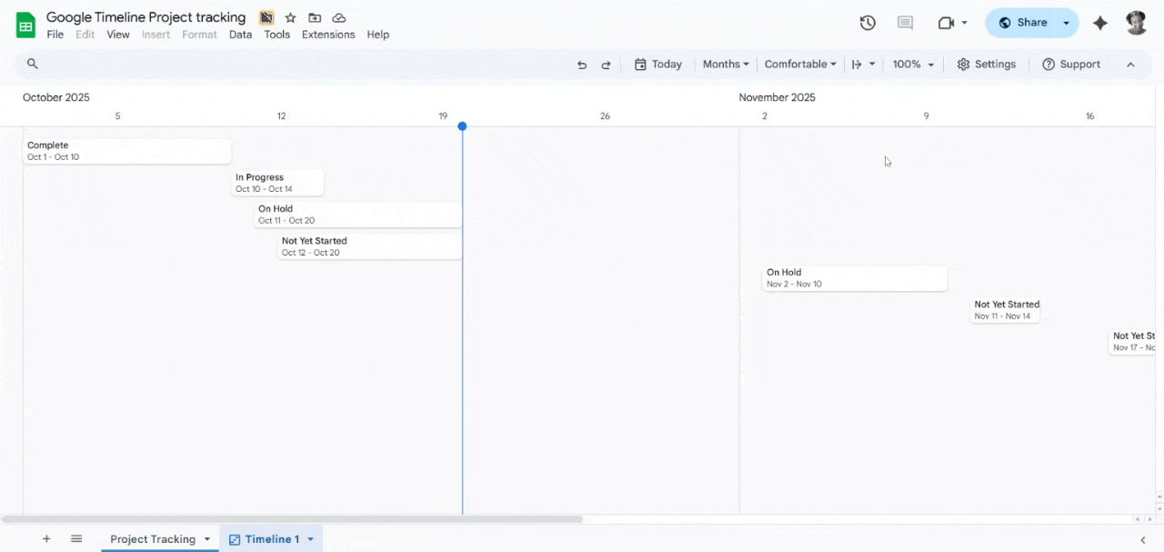 是的。您可以通过更改时间刻度(天、周、月)、按任何数据列(如受托人或状态)对卡片进行分组以及自定义卡片颜色以直观地表示关键信息来自定义时间线视图。您还可以通过标准 Google 表格共享设置来控制谁拥有查看或编辑权限。
