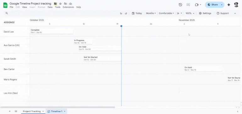 虽然很多人转向像 Asana 或 ClickUp 一样,Google Sheets 凭借其多功能的规划和可视化功能提供了一种有效的替代方案,让他们的项目保持在正轨上。 Google 时间线视图可让您轻松地将一组选定的文本和日期转换为新电子表格选项卡中具有视觉吸引力的水平时间线。