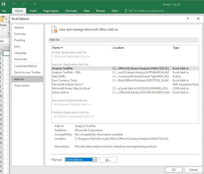 - 選擇“加載項”,選擇管理旁邊的 Excel 加載項,然後單擊“執行”。