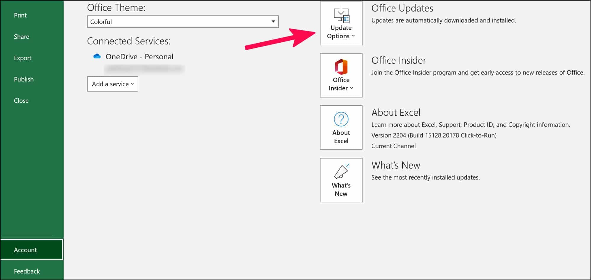 - 打開 Excel,轉到“文件”選項卡,然後選擇“帳戶”,