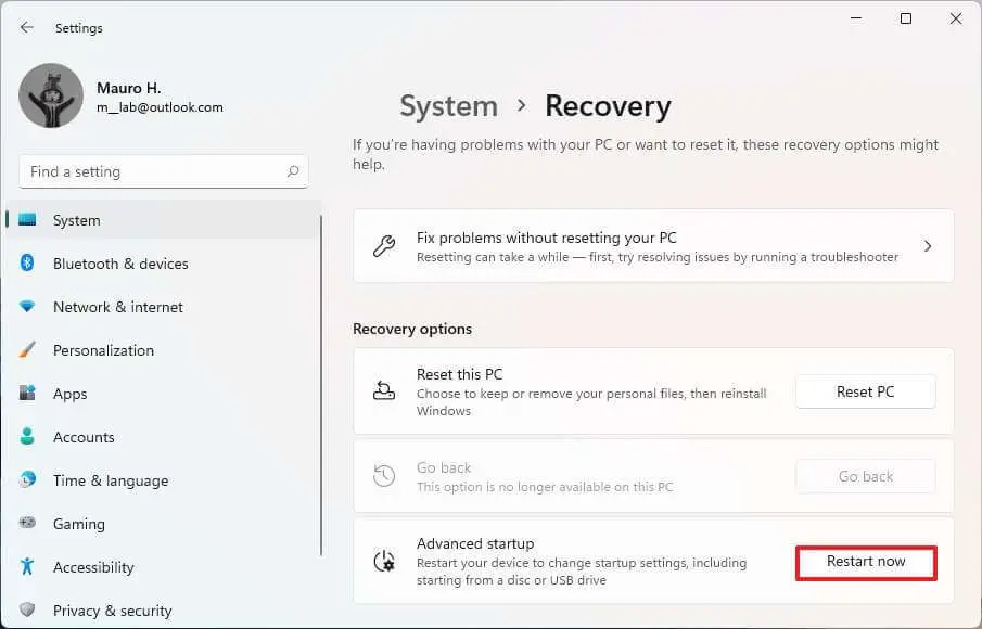 - 在“恢復選項”下,單擊屏幕右側的“立即重新啟動”按鈕。 (在“高級啟動”選項旁邊。)