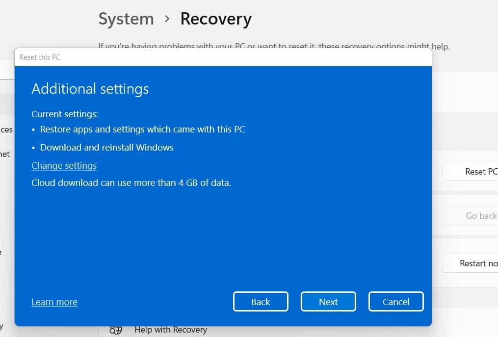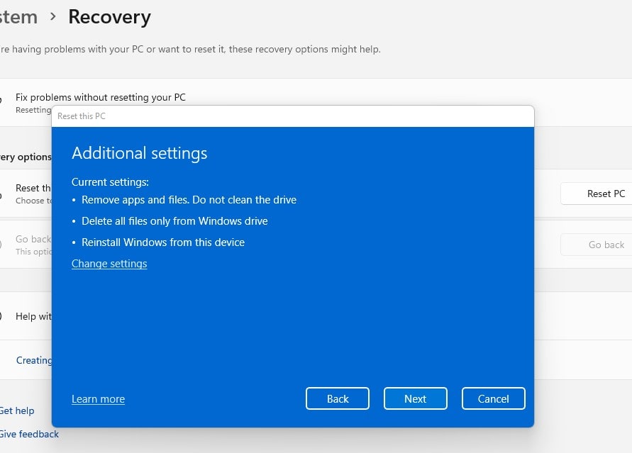 - 單擊更改設置選項。 (這是可選的,您可以忽略並單擊“下一步”繼續重置 Windows 11。