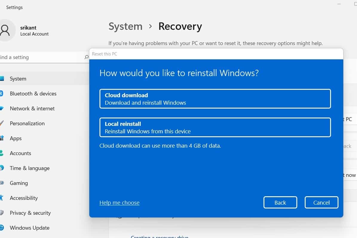 - 接下來,根據您想要如何重置系統,在雲下載或本地重新安裝之間選擇選項。