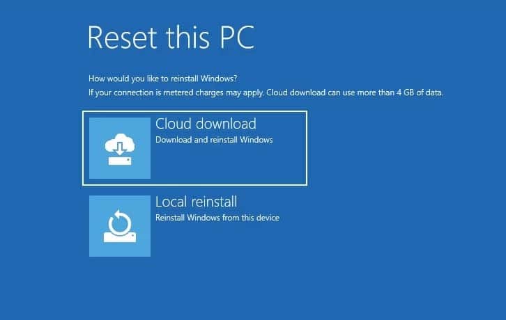 接下來,您必須選擇雲下載和本地重新安裝其中第一個選項下載所需的操作系統文件,然後執行重新安裝。第二個選項使用設備中的現有系統文件來重新安裝 Windows。