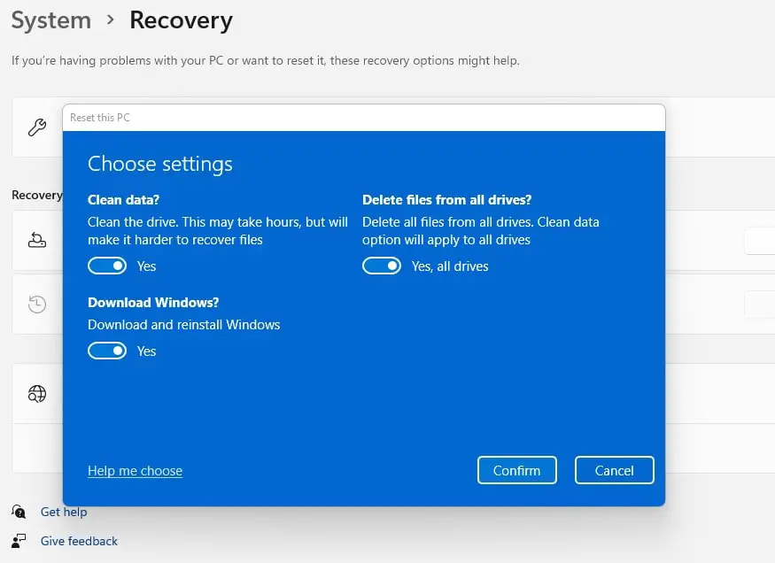 - 在這里切換包括乾淨數據的所有選項,從所有驅動器刪除文件,然後單擊確認。
