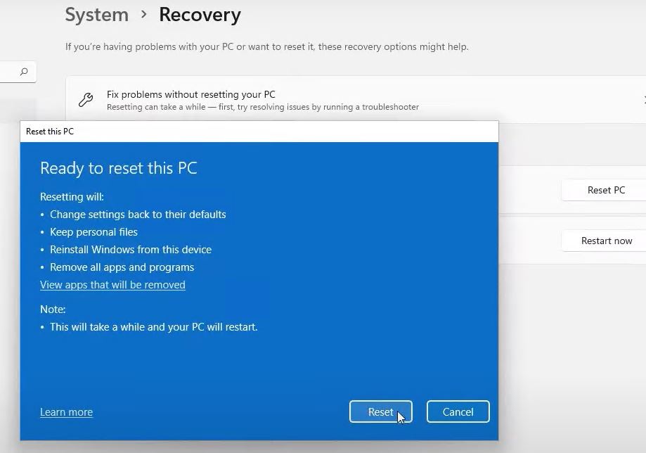 最後,當您準備好後,單擊重置按鈕。您的計算機將重置為出廠設置並保留您的文件。
