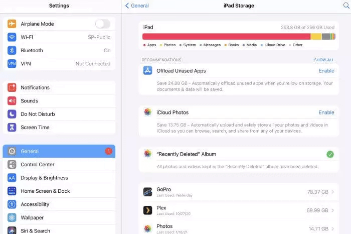 如果您的iPad沒有足夠的存儲空間,則可能會導致凍結或崩潰。要釋放存儲空間,請轉到“設置”應用程序,點擊“一般”,然後點擊iPhone存儲。在這裡,您可以看到哪些應用程序佔用最多的存儲空間並刪除它們。