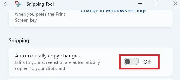 - 如果應用程序在截屏時崩潰,請打開截圖工具,單擊右上角的三個點,然後選擇“設置”。並關閉“自動複製更改” 截圖下的選項。