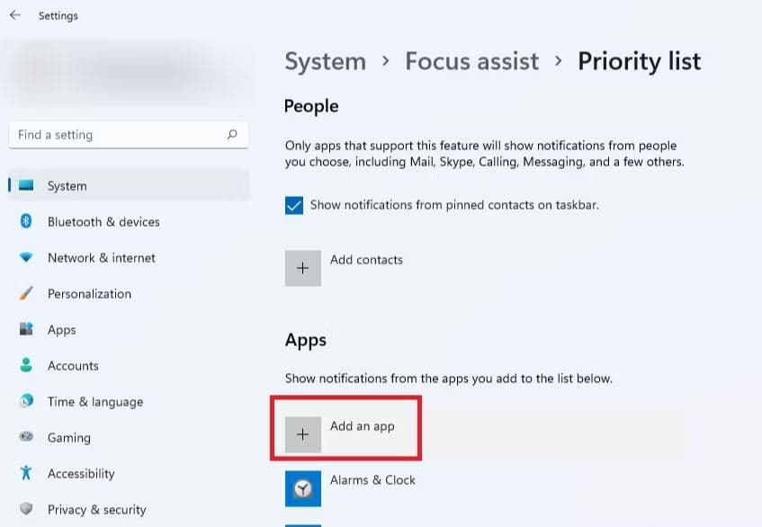 - 在 Focus Assist 中,選擇僅優先級選項,然後單擊自定義優先級列表