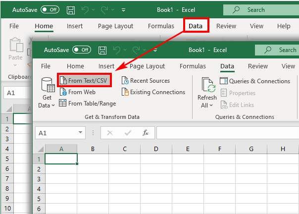 - 2啟動Microsoft Excel。去“數據”選項卡,然後單擊“獲取數據”>“來自文本/CSV。 ”