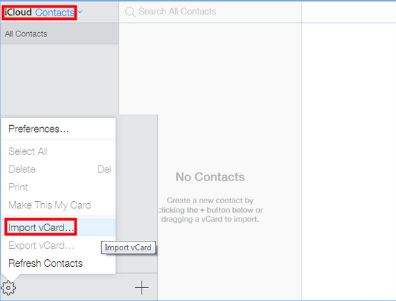 - 3單擊“聯繫人”以訪問您的iCloud聯繫人。然後單擊左下角的齒輪圖標,然後選擇“導入vcard”。