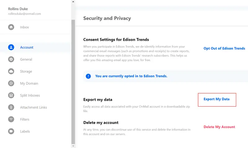 - 等待24至48小時,轉到您的帳戶,然後選擇下載我的數據選項。