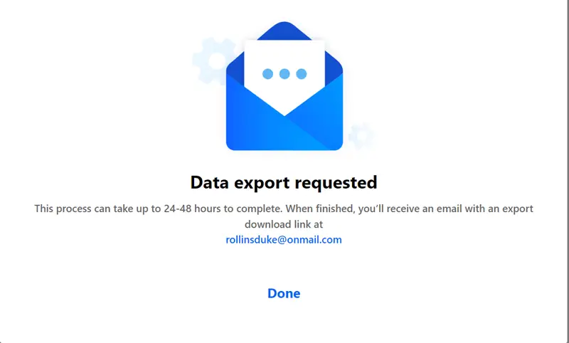 - 請求數據導出“此過程最多可能需要 24-48 小時才能完成。完成後,您將在您的電子郵件地址中收到一封包含導出下載鏈接的電子郵件。”點擊完畢。