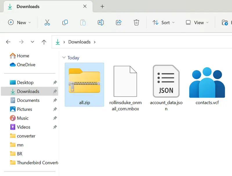 - 提取 ZIP文件並查看您的 OnMail 數據已下載,包括電子郵件(多媒體盒子)、聯繫人(VCF)和帳戶數據(JSON)。