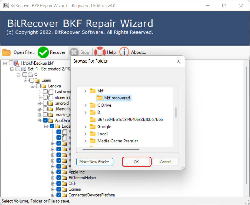 - 選擇所需的位置路徑後,單擊“確定”按鈕,現在您的 BKF 文件錯誤已修復,並且 BKF 文件數據已成功存儲在您的系統中