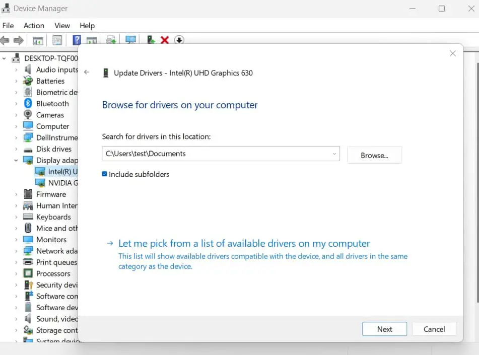 - 接下來選擇“瀏覽我的計算機以查找驅動程序,然後單擊“讓我從計算機上的可用驅動程序列表中進行選擇”。