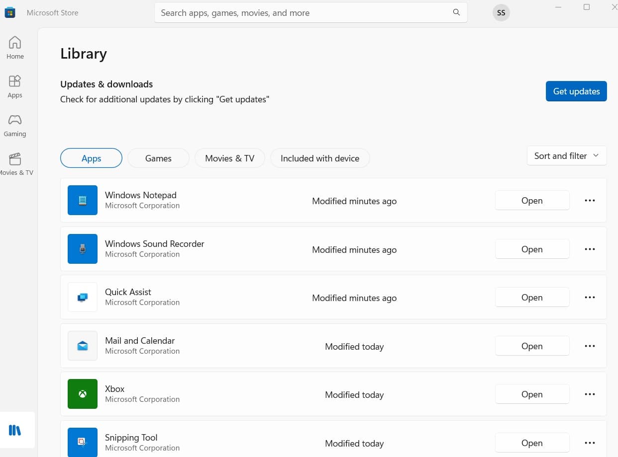 - 單擊獲取更新按鈕位於右側,檢查是否有適用於您的應用程序的可用更新,包括 Microsoft Store。