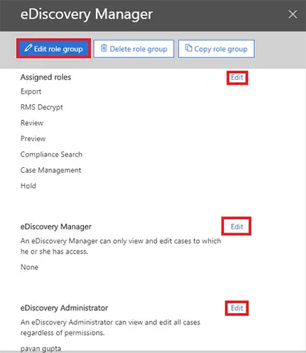 - 檢查電子取證管理器選項。之後,單擊編輯圖標,用於分配發現管理組必需的重要角色。