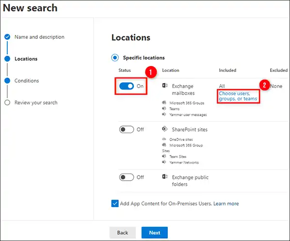 - 點擊後新搜索選項,將出現一個新的嚮導。該嚮導將允許您自定義內容搜索選項的所有組件。用戶可以輸入搜索名稱和描述。位置選項允許您指定要導出的郵箱數據。