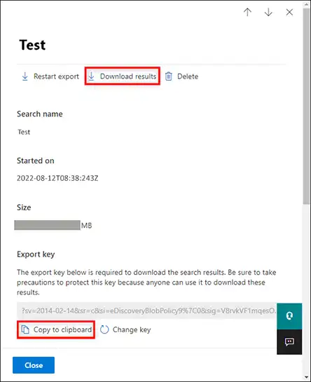 - 導出過程完成後,您需要單擊下載結果選項卡。不要忘記複製獨特的鑰匙通過單擊複製到剪貼板選項。這是強制性的,因為下一步將要求唯一的導出密鑰。