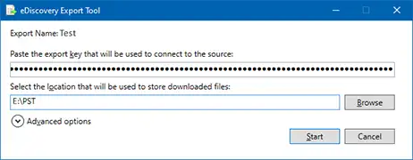 - 現在,電子取證導出工具單擊“下載結果”後將自動啟動。它會要求您粘貼將用於連接到源的導出密鑰。瀏覽存儲生成的 PST 文件的目標路徑。單擊開始按鈕將郵箱從 Office 365 下載到 PST。