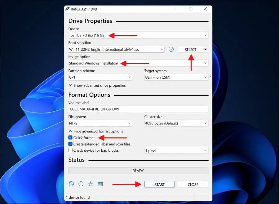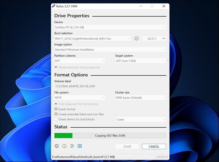 - 單擊“開始”按鈕啟動 Windows 11 可啟動 USB 驅動器的創建過程。