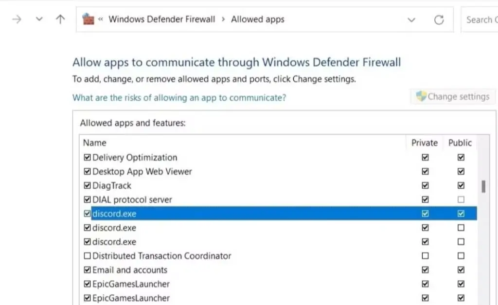 - 單擊“更改設置”,然後在列表中找到“Discord”並標記“私人”和“公共”複選框。