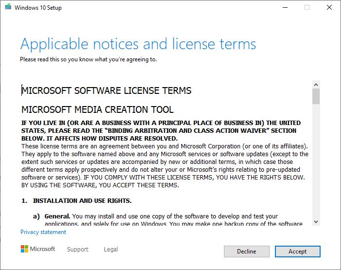 - 媒體創建工具將在繼續之前準備一些事情,接下來您必須接受 Microsoft 許可協議才能繼續。